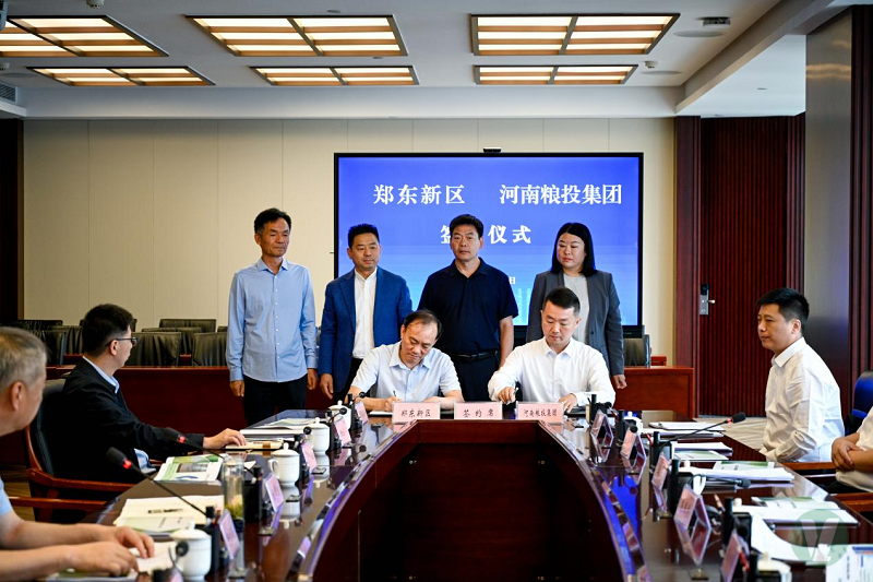 5月8日,河南糧投集團與鄭東新區管委會豫糧智谷項目簽約儀式在鄭州舉行。省紀委監委駐農投紀檢組組長魯照印,省農業和農村廳市場和信息化處處長崔新麗, 鄭東新區黨工委副書記、管委會主任陳耀宗,鄭州市人大常委會鄭東新區工作委員會主任蘇瑩璽, 鄭東新區黨工委委員、管委會副主任楊寶安,鄭東新區國資集團籌備組組長李力,河南糧投集團黨委書記、董事長王剛,黨委副書記、紀委書記李在良,副總經理馬曉勇等出席簽約儀式。雙方有關部門負責人以及項目對接團隊工作人員等共30余人參加簽約活動。